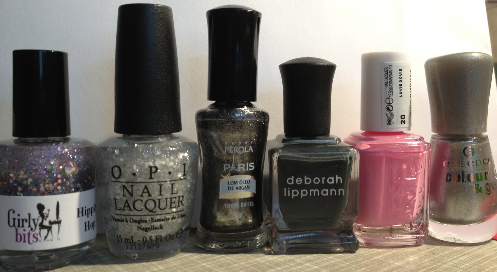 Girly Bits Hippity Hop, Opi Pirouette my Whistle, Perola Paris Torre Eiffel, Deborah Lippmann Stormy Weather, Essie Lovie Dovie and Essence Icy Princess: